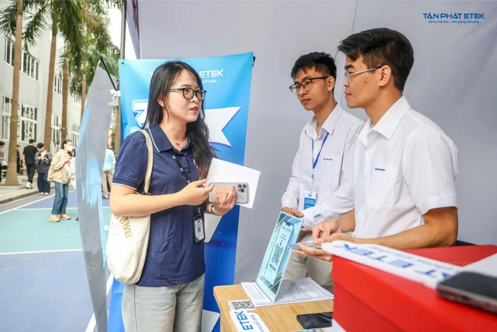 Ngay từ những khung giờ đầu tiên, gian hàng Tân Phát ETEK đã “đỏ lửa” với lượng sinh viên ghé thăm liên tục. Không khí tại booth luôn tràn đầy năng lượng với những cuộc trao đổi cởi mở, thực tế và gần gũi.